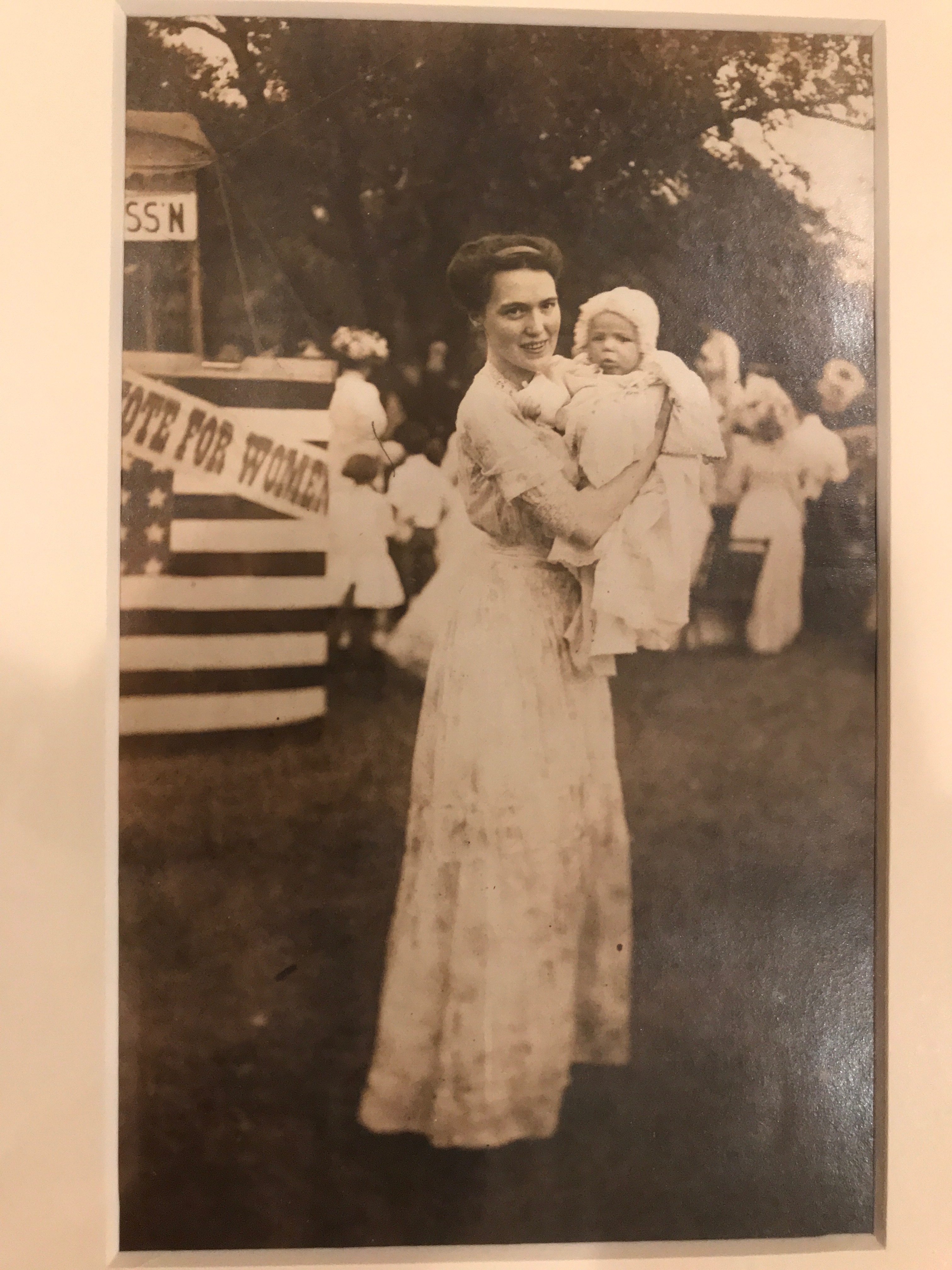 One of my favorite historical photographs is a picture of my husband David’s grandmother (who was named Laura but called Mimi by her family) holding his mother–then an infant–also named Laura. It was taken in the fall of 1922 at an outdoor event, likely in the suburbs of Chicago, and if you look closely in the background, you can see a flag-draped booth with a banner that reads “Vote for Women.” Because this photo was taken after the 19th amendment granted women the constitutional right to vote, I have always assumed that the setting was a political rally for a female candidate. It would be entirely in keeping with Mimi’s interests and values to support female political candidates; she was close friends with Isabella Greenway, the first U.S. Congresswoman from Arizona and a bridesmaid at the wedding of Eleanor and Franklin D. Roosevelt.