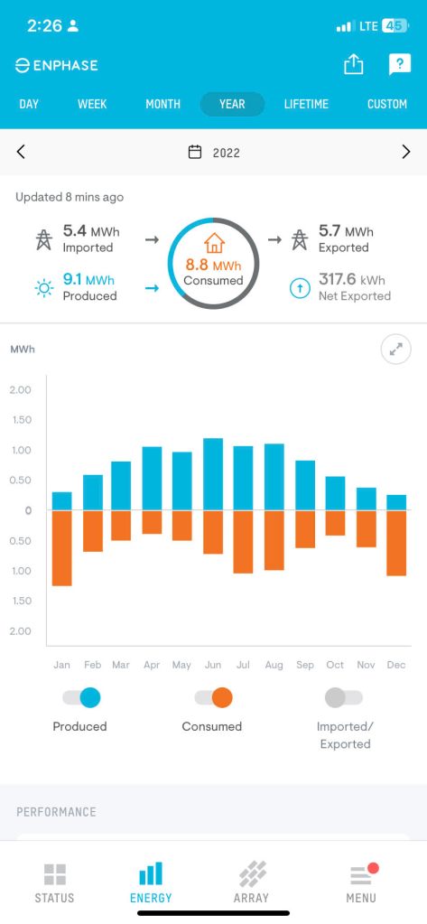 So how does this all wash out financially? It may take 10 years before we recover the nearly $15,000 we spent on the installation (after the tax credit, which was 26% in 2020 when we purchased our system). Future increases in electricity rates would reduce the length of the payback period, of course. And at the time, we didn’t factor into the cost-benefit equation a higher resale value for our house. Given the recent and projected increase in popularity of EVs, I would now consider our system to be a selling point if we were planning to list our home.